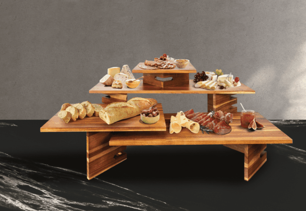 Crafted from richly grained teak, the Durawood Collection brings warmth, structure, and endless versatility to your display. Risers interlock, shelves swap, and the whole system nests neatly when service wraps. It’s made to work hard — and look good doing it.