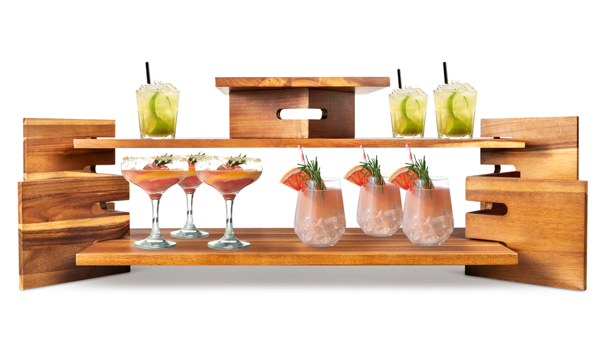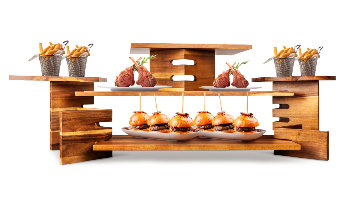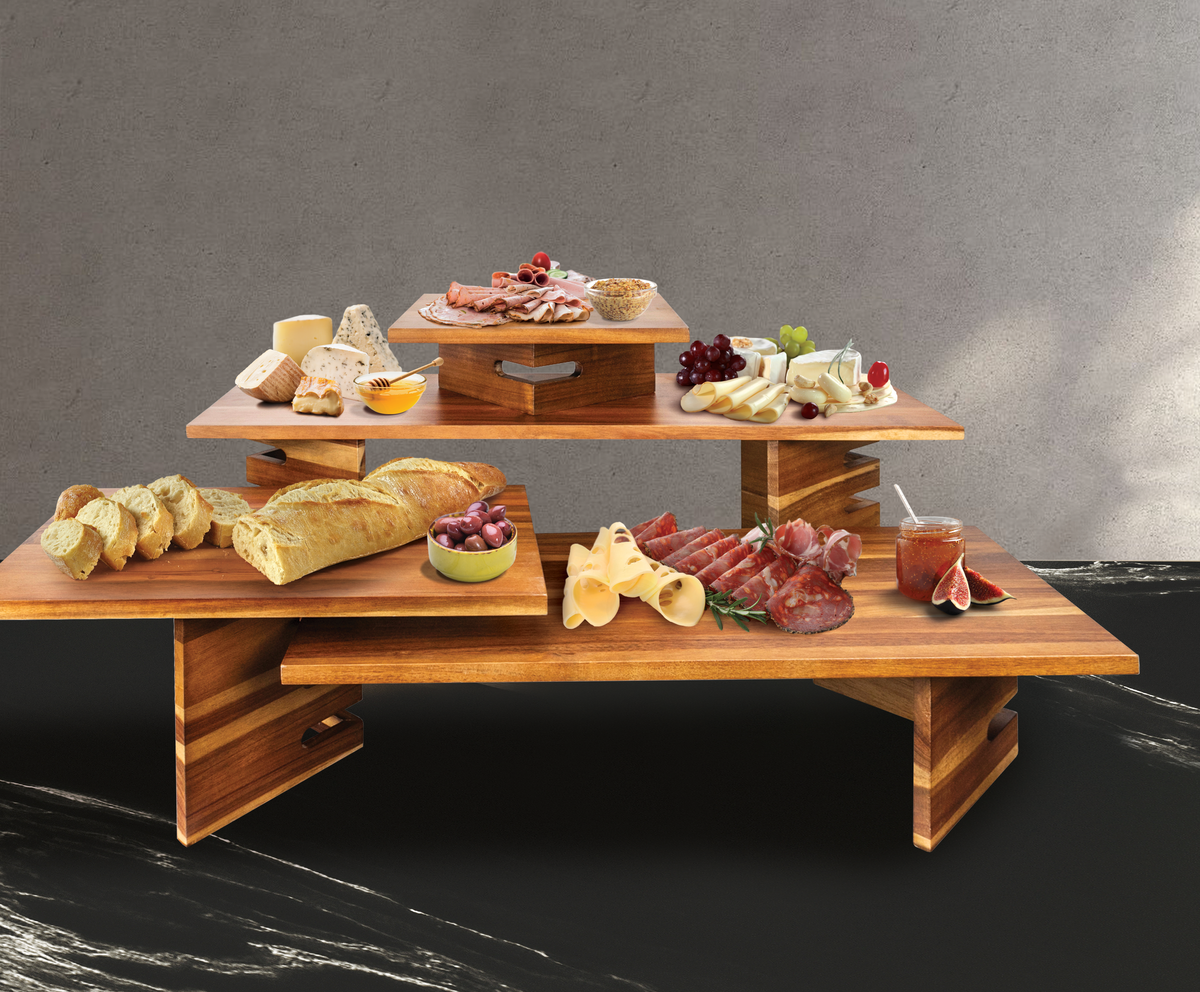Crafted from richly grained teak, the Durawood Collection brings warmth, structure, and endless versatility to your display. Risers interlock, shelves swap, and the whole system nests neatly when service wraps. It’s made to work hard — and look good doing it.