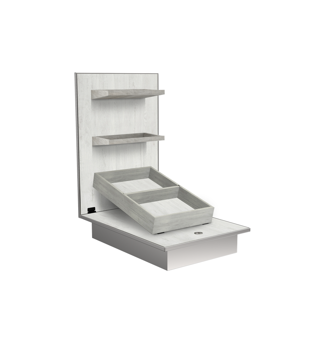 Go big on visuals, small on floor space. The Q-Bik Buffet System stands tall with stacked tiers, maximizing upward space while keeping everything easily within reach. With its multi-level design and integrated lighting options, every presentation becomes a striking centerpiece.