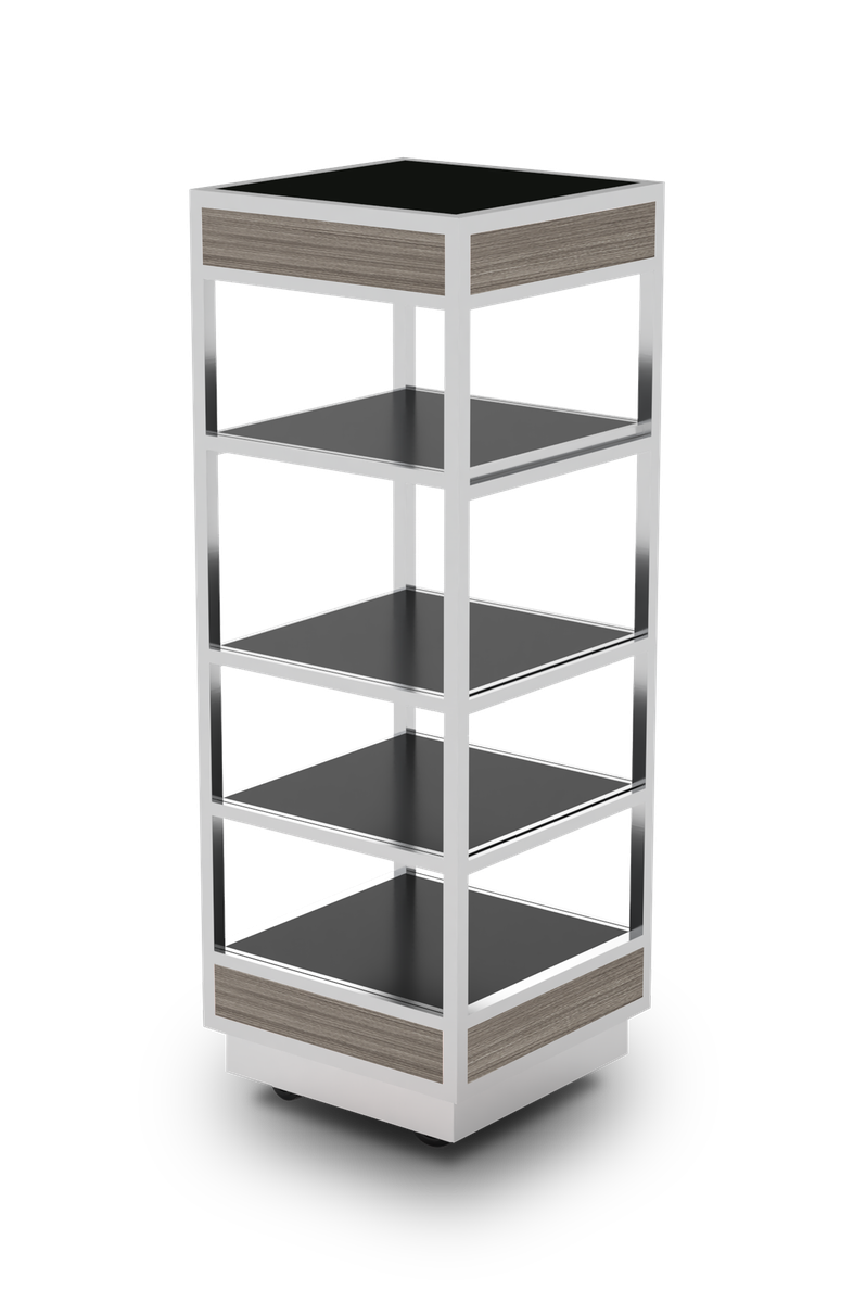 - Medium, 4-tier display stand with heavy-duty locking and swivel casters