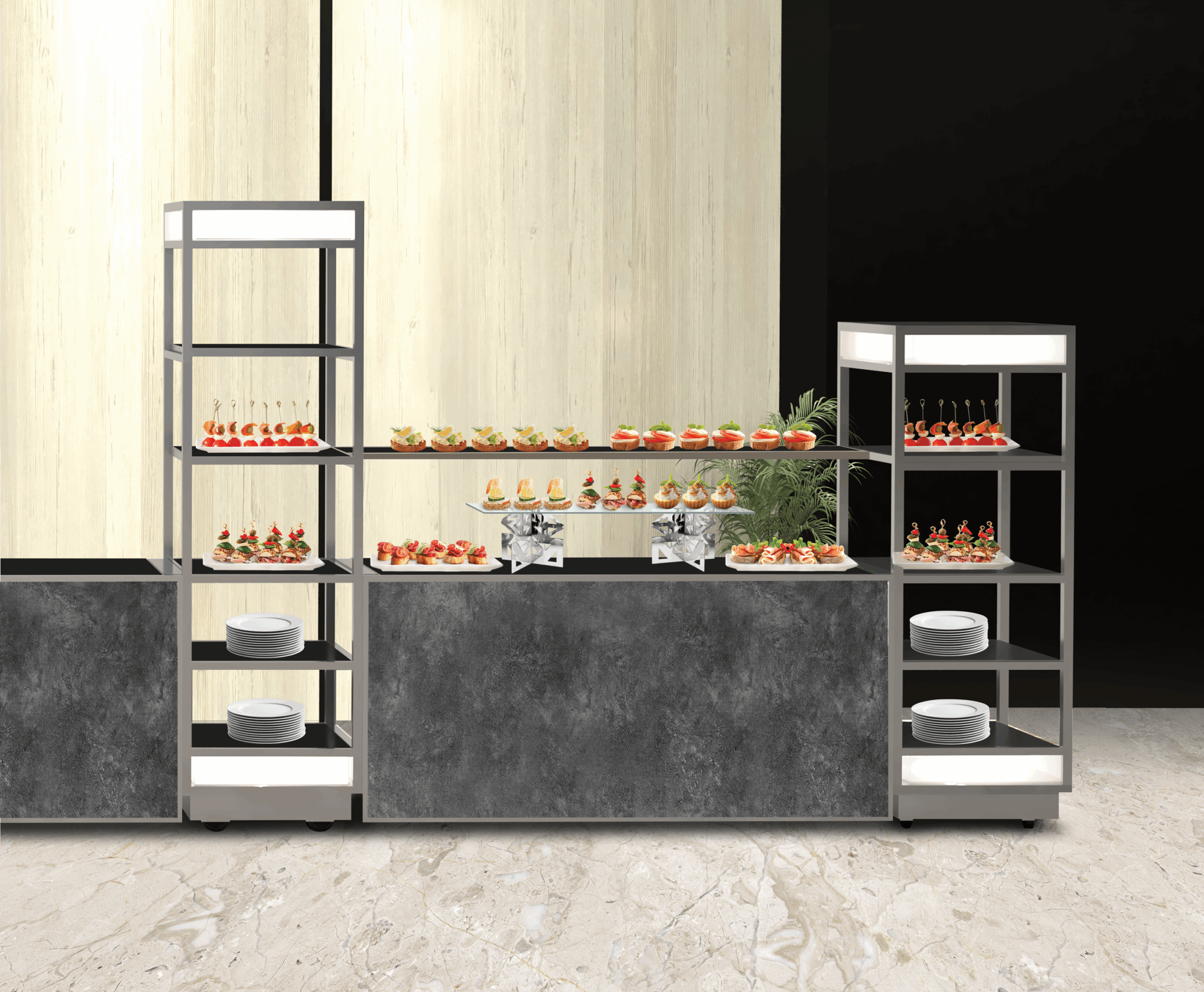Go big on visuals, small on floor space. The Q-Bik Buffet System stands tall with stacked tiers, maximizing upward space while keeping everything easily within reach. With its multi-level design and integrated lighting options, every presentation becomes a striking centerpiece.