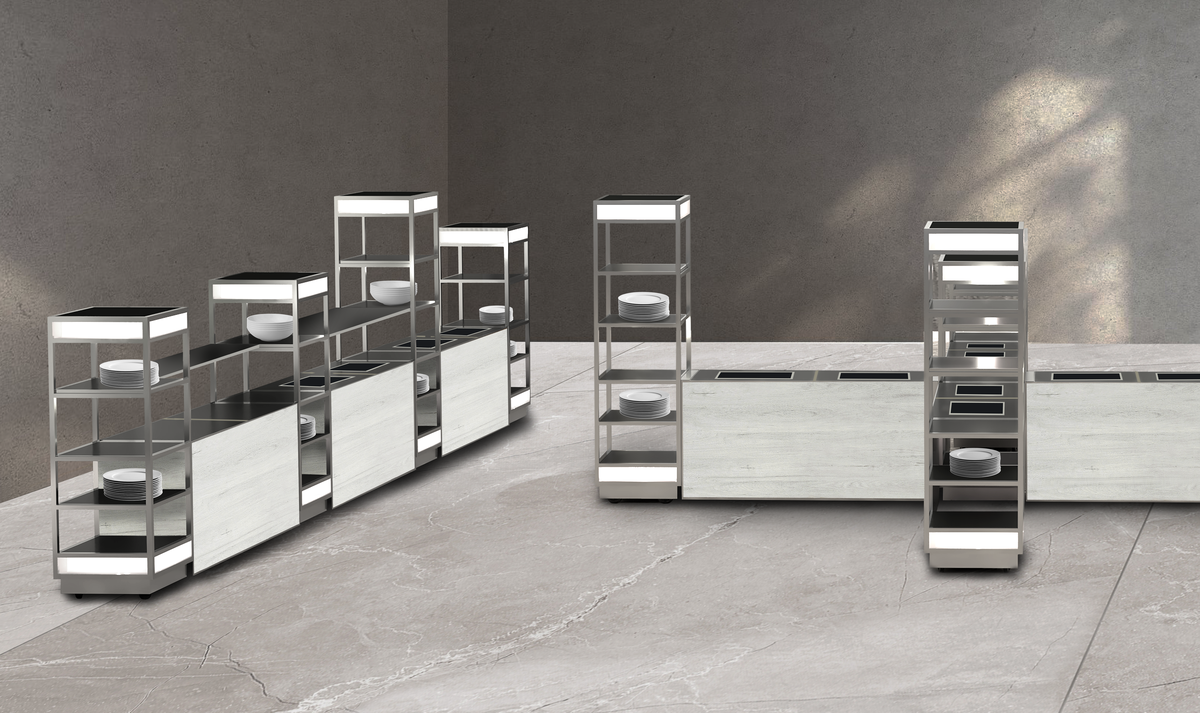 Go big on visuals, small on floor space. The Q-Bik Buffet System stands tall with stacked tiers, maximizing upward space while keeping everything easily within reach. With its multi-level design and integrated lighting options, every presentation becomes a striking centerpiece.