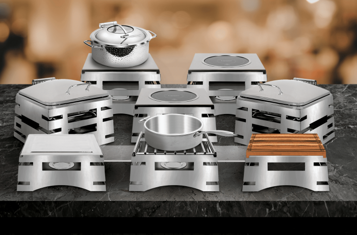 - Optional inserts sold separately: Hinged chafer, grill, griddle, carving board, induction stove, and ice bin