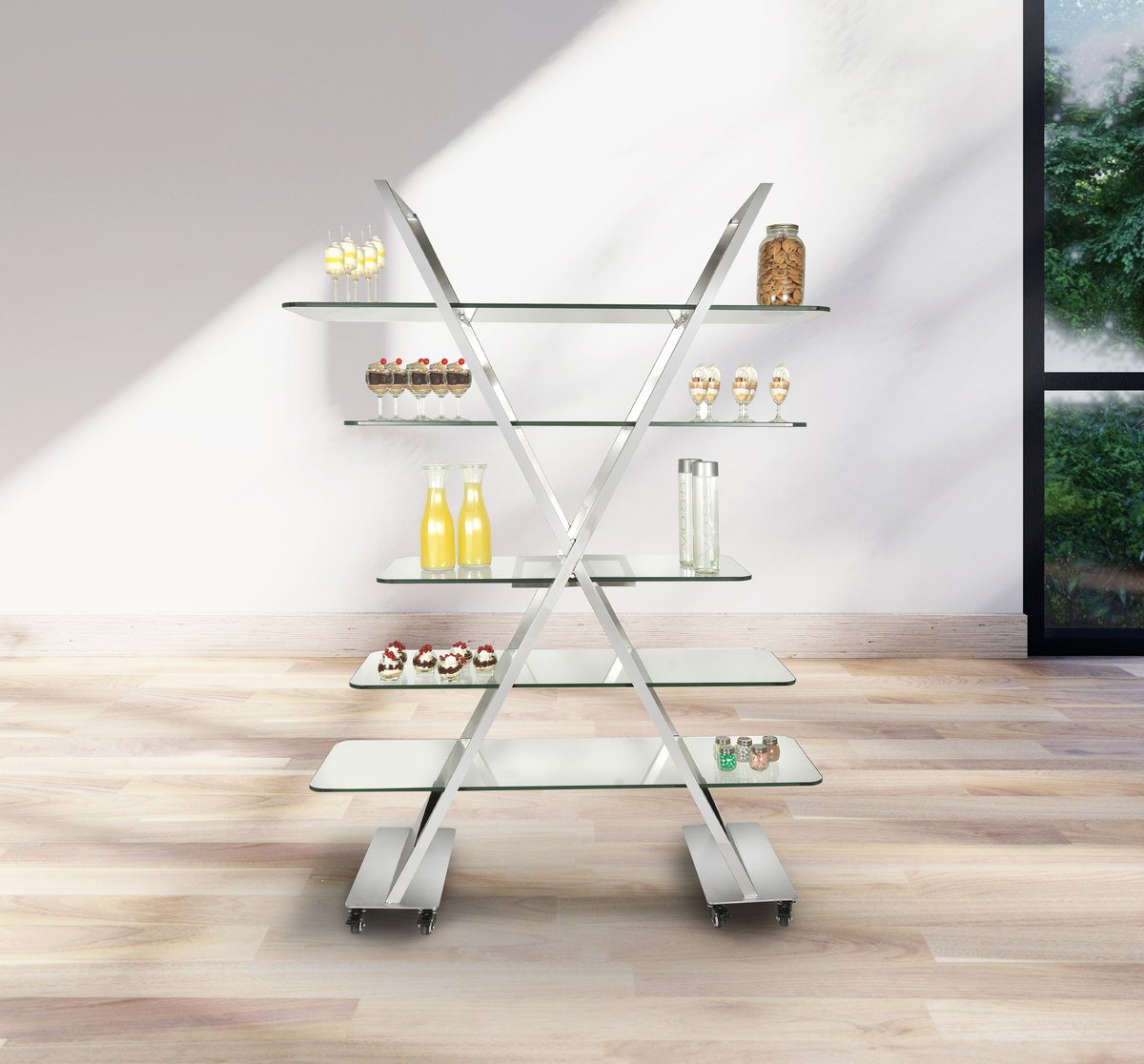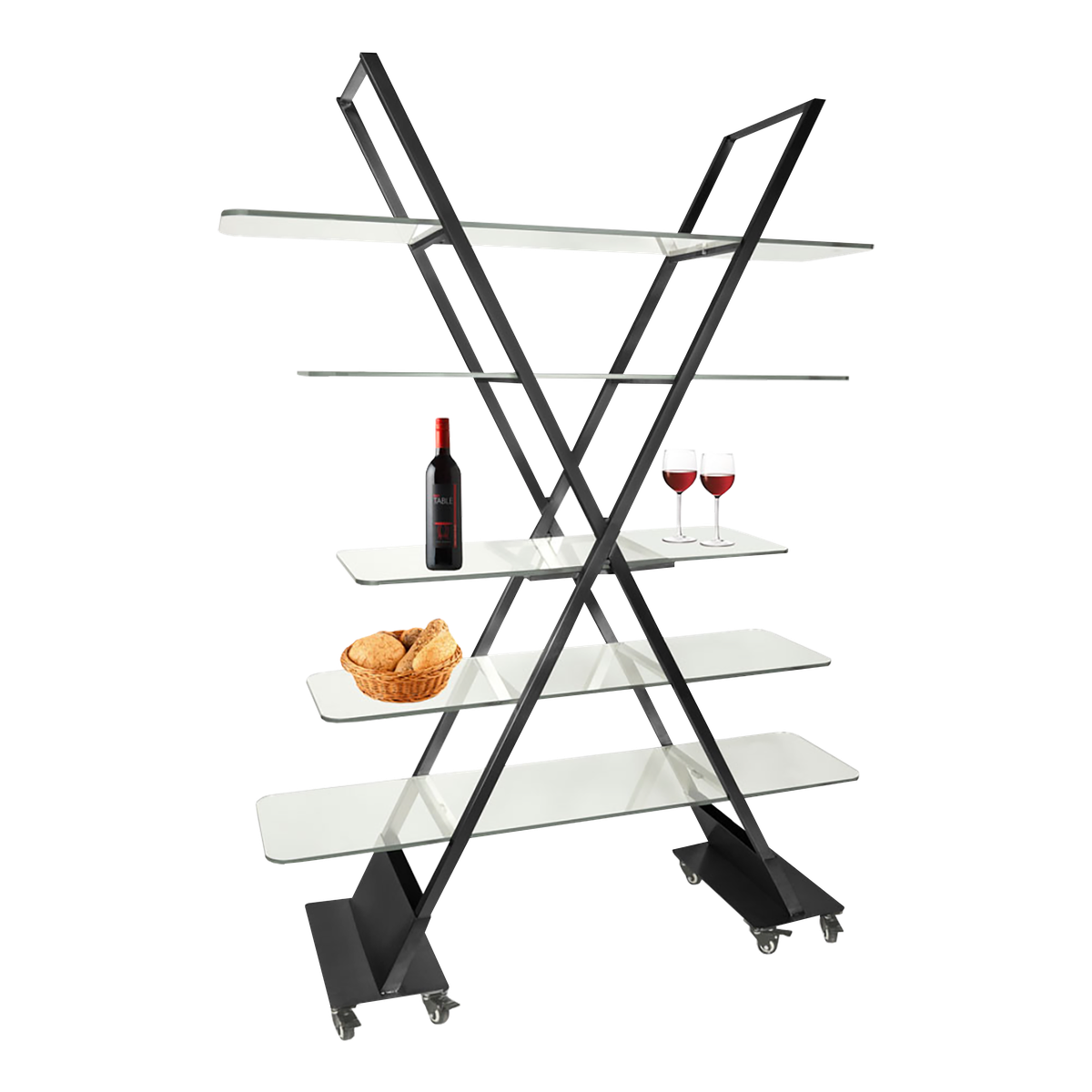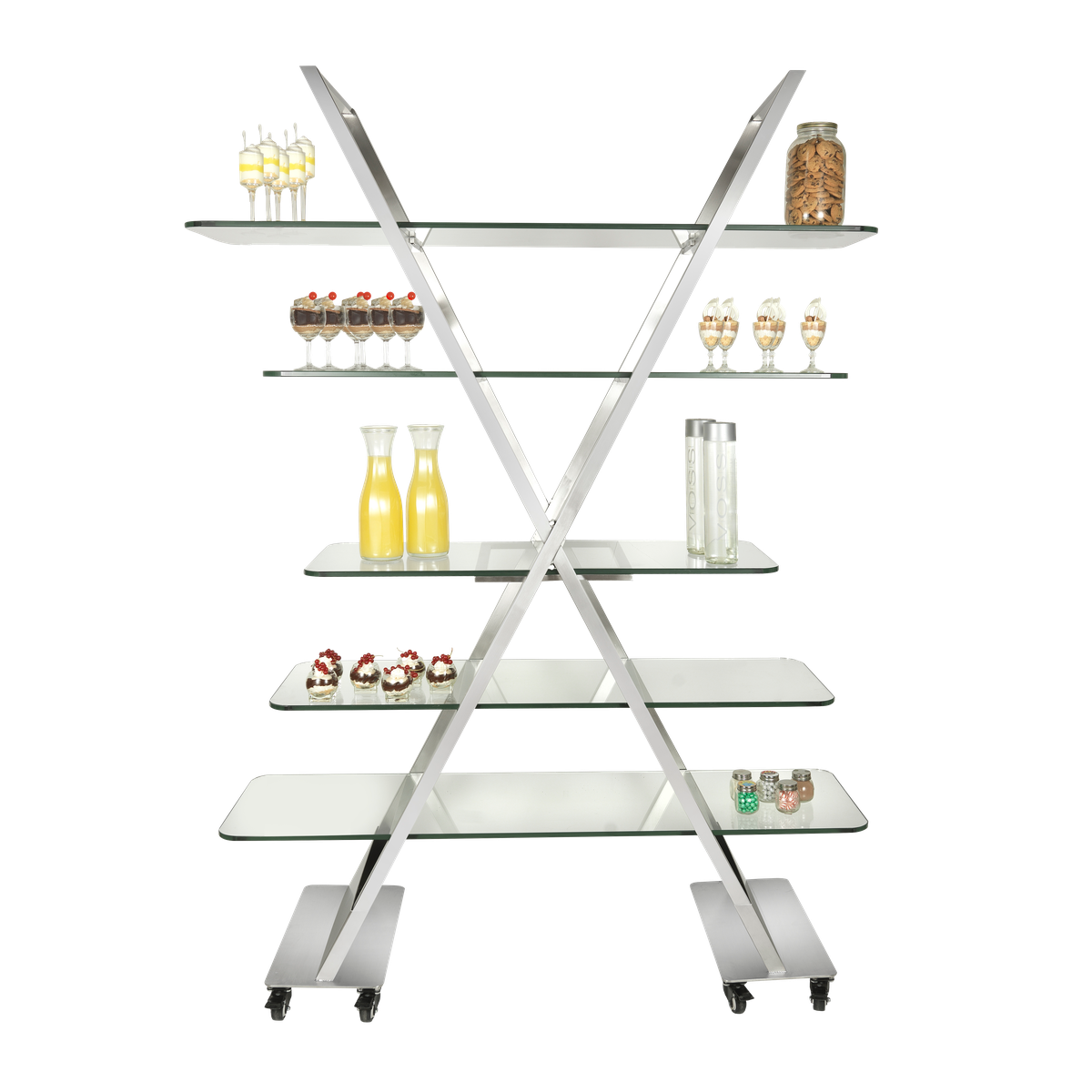 - Includes (5) glass shelves with rounded edges: (2) 15-1/4" x 55-1/4", (2) 15-1/4" x 47-3/8", (1) 15-1/4" x 39-1/2"