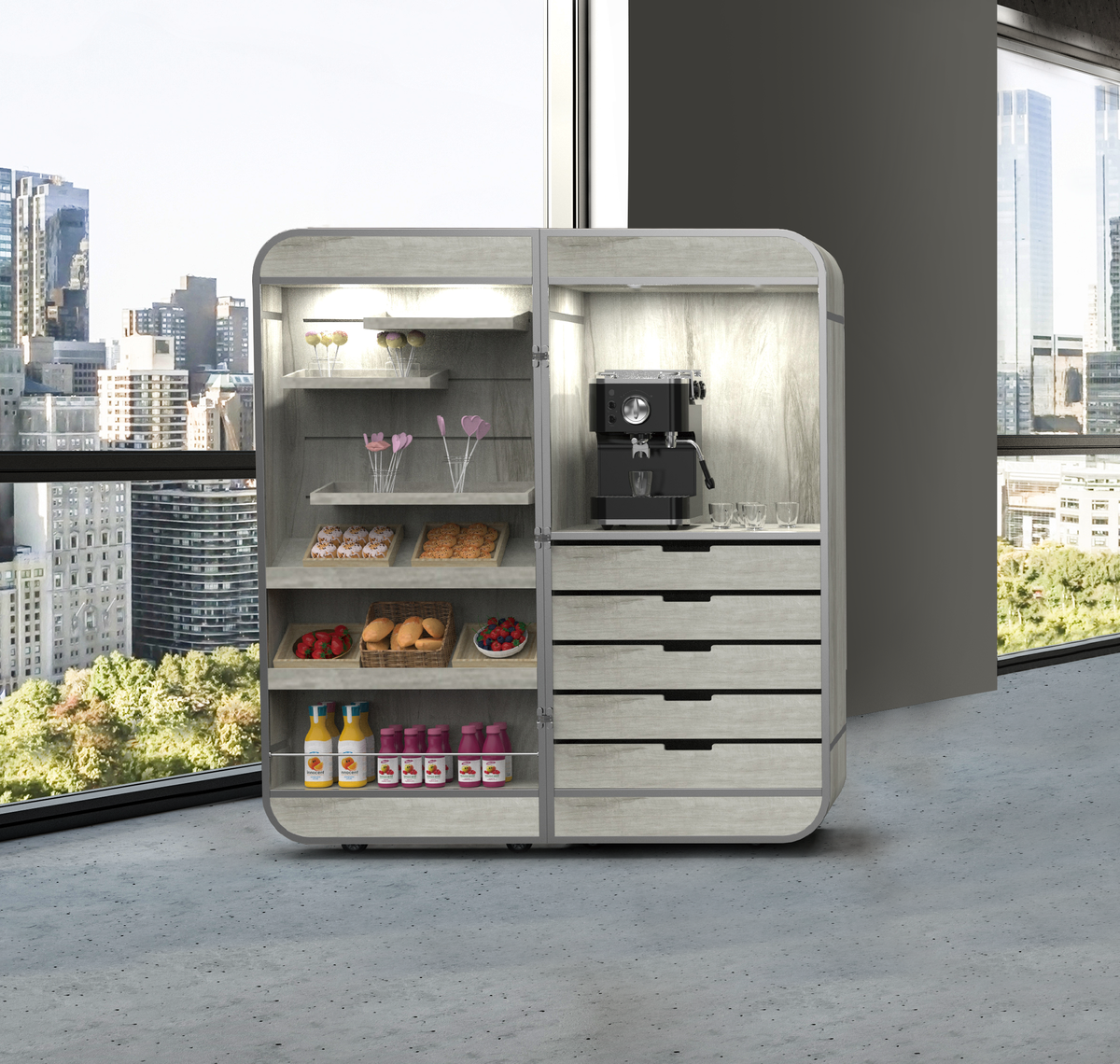 - Loaded interior — 5 drawers, 3 rail shelves, 6 half shelves, 4 red lights, and 2 outlets